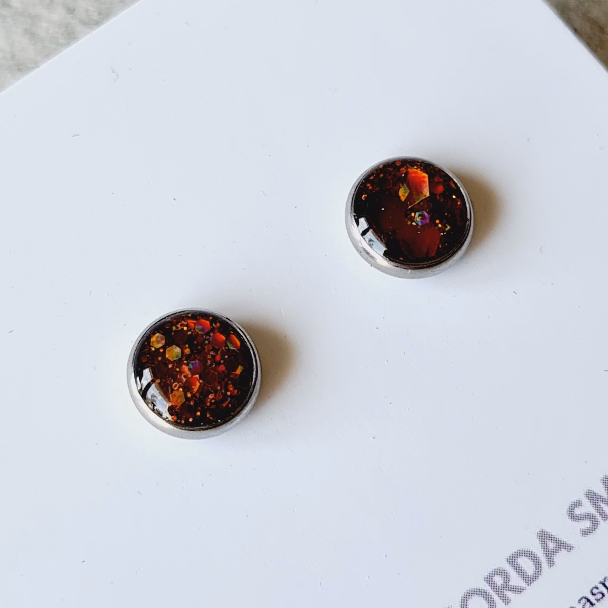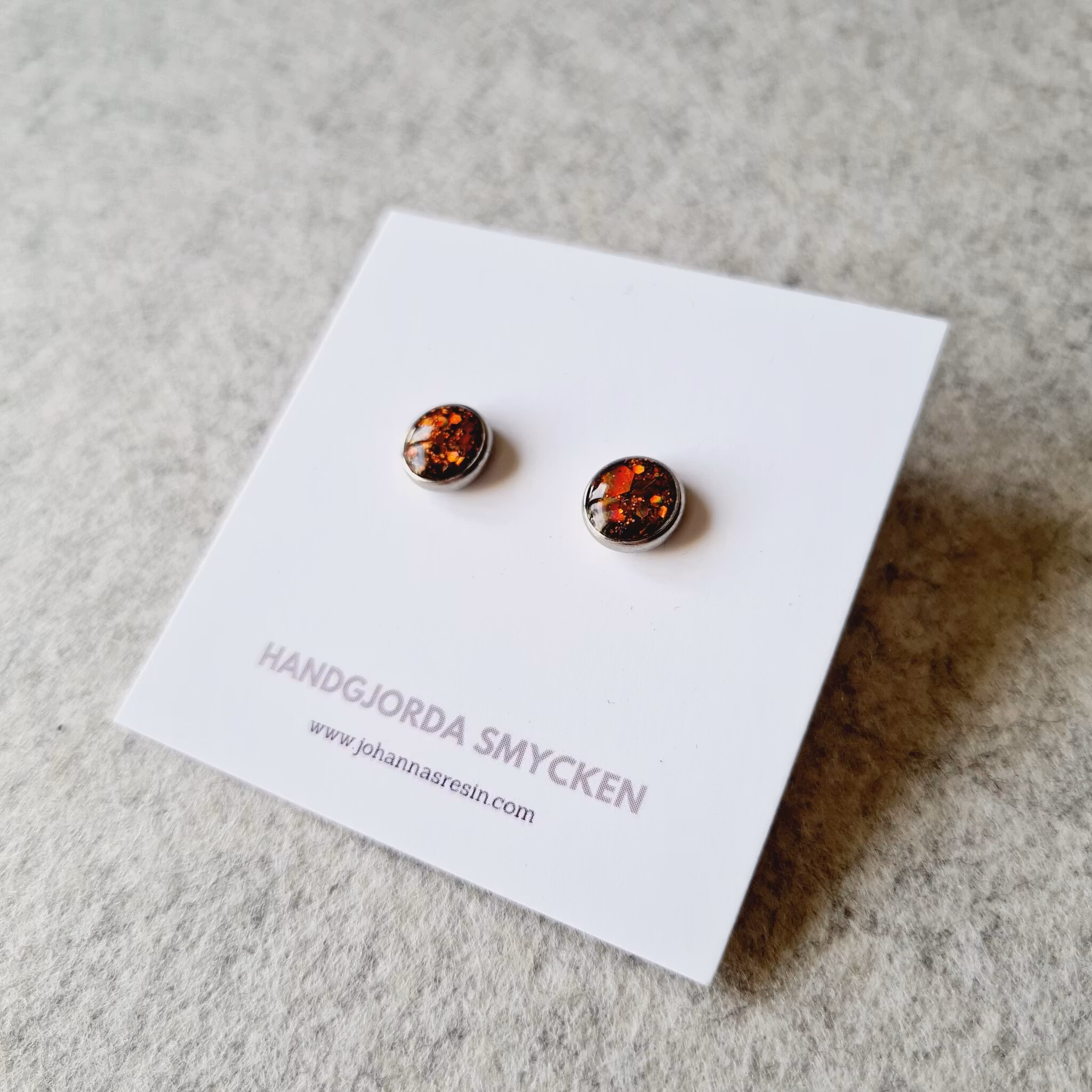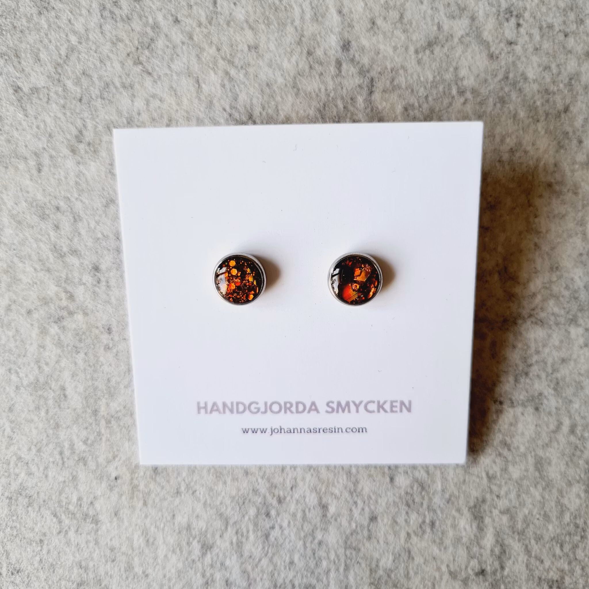 Handgjort örhänge i stål med mörkt kopparfärgat glitter. 10 mm diameter.